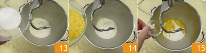 Pour réaliser la pâte, assurez-vous d'utiliser un levain rafraîchi au moins 2 fois dans la journée, fort et bien mature. Mettez dans le bol du robot pâtissier équipé du crochet, la farine et une partie du sucre en poudre 13. Ajoutez les œufs 14 et la levure de bière 15.