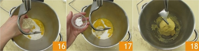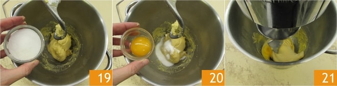 Ajoutez maintenant le sucre restant 19 et le jaune d'œuf 20. Travaillez encore jusqu'à ce qu'elle soit lisse 21.