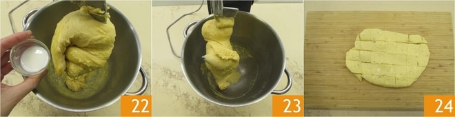 Enfin, ajoutez le lait 22 et continuez à pétrir jusqu'à ce qu'il soit bien absorbé 23. Entre-temps, reprenez l'émulsion de beurre et coupez-la en cubes 24.