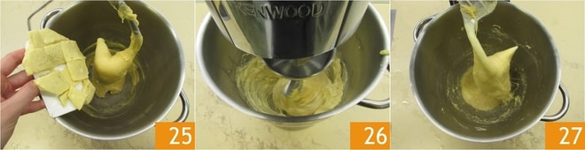 Incorporez-la à la pâte en deux fois 25, en continuant à travailler 26 jusqu'à ce qu'elle soit complètement absorbée 27.