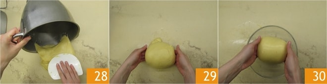 Transférez la pâte sur un plan de travail 28 et effectuez des plis slap and fold 29. Transférez dans un bol 30. Couvrez avec un film plastique et laissez reposer à température ambiante pendant 30 minutes, puis transférez au réfrigérateur pendant 8-10 heures à une température de 4 degrés.