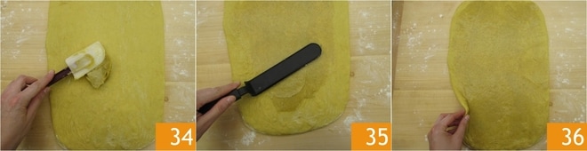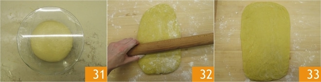 Quand la pâte aura doublé de volume 31, transférez-la sur un plan légèrement fariné et étalez-la avec un rouleau à pâtisserie 32, vous devez obtenir une forme rectangulaire de 36x28 cm 33.
