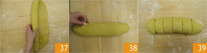 Continuez à rouler la pâte 37, de manière à obtenir un rouleau 38. Coupez-le ensuite en 6 morceaux égaux 39.