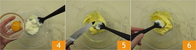 Ajoutez les jaunes d'œufs 4 et mélangez à nouveau. Ajoutez ensuite les graines de la gousse de vanille 5 et mélangez bien le tout 6.
