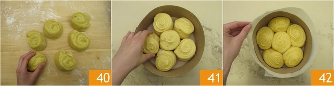 De cette manière, vous obtiendrez 6 roses 40. Arrondissez-les un peu avec les mains et placez-les dans un moule en papier de 20 cm, en en mettant 1 au centre et les autres autour 41. Couvrez avec un torchon et laissez lever pendant 6 heures à température ambiante, ou dans un four éteint avec seulement la lumière allumée pendant 3-4 heures.