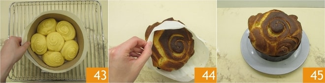 Transférez sur une grille 43 et faites cuire dans un four statique préchauffé à 150 degrés pendant 55 minutes. Sortez du four et laissez refroidir. Retirez le papier sulfurisé 44 et servez votre gâteau des roses avec levain 45.