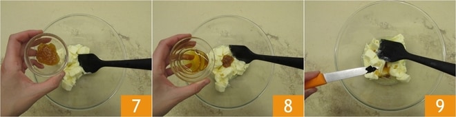 Préparez également l'émulsion de beurre. Dans un autre bol, mettez le beurre pommade, ajoutez la pâte de zeste d'orange 7, le miel 8 et les graines de la gousse de vanille 9. Mélangez jusqu'à obtenir une crème, comme précédemment.