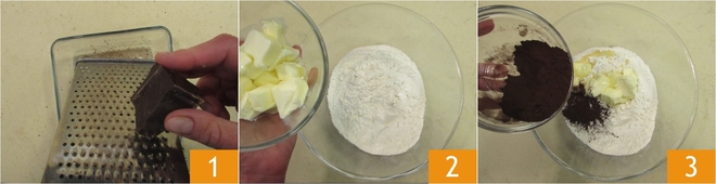 Pour réaliser le gâteau émietté au chocolat et à l'orange, commencez par râper le chocolat noir avec une râpe à mailles fines 1 et préparez la pâte : versez dans un bol la farine, le beurre froid en dés 2 et le cacao en poudre 3.