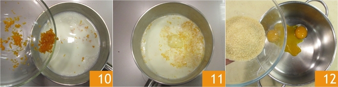 Passez à la crème : versez dans une casserole le lait et le zeste d'orange 10 et portez à ébullition légère 11. Pendant ce temps, mélangez les jaunes d'œufs et le sucre de canne dans une autre casserole en utilisant une maryse, pour incorporer le moins d'air possible 12.