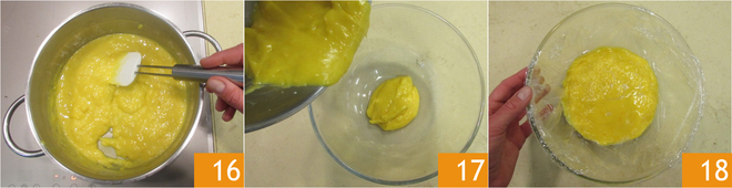 Portez le mélange sur le feu et faites cuire pendant environ 5 minutes, en mélangeant de temps en temps 16. Lorsque vous obtenez une crème lisse et épaisse, transférez-la dans un bol 17 et couvrez avec du film plastique en contact 18. Laissez tiédir et mettez au réfrigérateur pendant environ une heure.