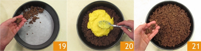 Après ce temps, vous êtes prêts à assembler le gâteau : tapissez un moule de 20 cm de diamètre de papier sulfurisé et répartissez la moitié de la pâte jusqu'à couvrir toute la base 19. Versez la crème à l'orange et nivelez-la avec le dos d'une cuillère, en laissant deux centimètres du bord 20, puis émiettez le reste de la pâte jusqu'à couvrir toute la surface 21.