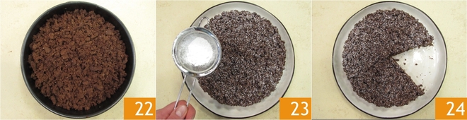 Pressez délicatement la surface du gâteau avec les mains et faites cuire au four statique préchauffé à 180° pour 45 minutes 22. Une fois cuit, retirez du four et laissez refroidir. Saupoudrez le gâteau émietté au chocolat et à l'orange avec un peu de sucre glace 23 et servez-le à température ambiante 24!