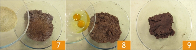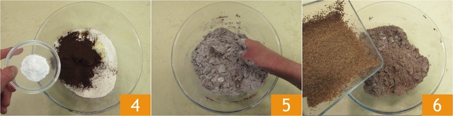 Ajoutez la levure 4 et pétrissez du bout des doigts pour obtenir un mélange sableux 5. À ce stade, ajoutez le chocolat râpé 6.