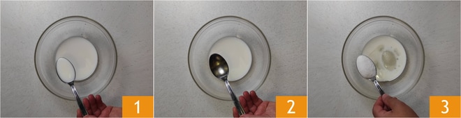 Pour préparer le gâteau en tasse sans œufs, versez dans un bol le lait 1, l'huile 2 et le sucre 3.