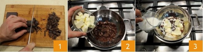 Pour réaliser le gâteau en tranches, commencez par préparer la base : hachez le chocolat noir 1 et faites-le fondre au bain-marie avec le beurre en morceaux 2. Versez le lait en filet 3 et