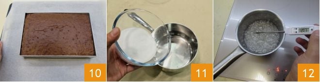 Une fois la cuisson terminée, sortez la base du four 10 et laissez-la refroidir. Pendant ce temps, préparez la crème au beurre : commencez par mettre dans une petite casserole à fond épais l'eau et le sucre 11, en chauffant à feu doux et en remuant de temps en temps avec une cuillère en acier. Une fois que le sucre est dissous, vérifiez que la température du sirop atteigne 121°C 12.