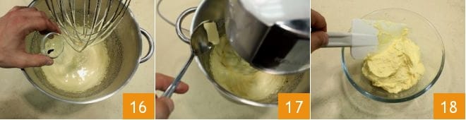 Incorporez ensuite les graines de la gousse de vanille 16 et le beurre ramolli à température ambiante dans le batteur 17, continuez à fouetter jusqu'à ce que le mélange soit crémeux. Transférez la crème au beurre obtenue dans un bol 18.