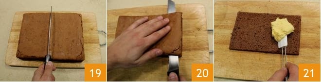 Lorsque le gâteau a complètement refroidi, coupez-le en deux pour obtenir deux gâteaux 19, puis coupez-le horizontalement en 3 parties 20. Garnissez la base avec une partie de crème au beurre à l'aide d'une spatule 21, puis