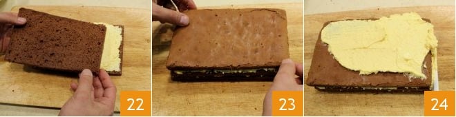 placez le deuxième rectangle 22 ; garnissez également la deuxième couche et enfin recouvrez avec la dernière 23. Recouvrez la surface et les bords du gâteau avec la crème au beurre, en la répartissant uniformément 24.