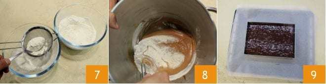 la farine 7, puis incorporez les ingrédients secs au mélange une cuillère à la fois. Mélangez de bas en haut avec une spatule pour amalgamer la pâte 8. Versez la pâte dans un moule rectangulaire de 20x25 cm 9 et faites cuire au four statique préchauffé pendant 45 minutes à 170°C (si le four est ventilé, 150°C pendant 35 minutes).