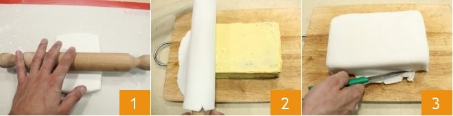 Une fois les gâteaux garnis, prenez la pâte à sucre et étalez-la à l'aide d'un rouleau à pâtisserie sur un plan de travail saupoudré de sucre glace 1. Couvrez ensuite les gâteaux 2, en lissant la surface avec un smoother. Avec un couteau à lame lisse, finissez les bords 3
