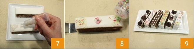 Avec la décoration en gel, décorez la surface de chaque tranche 7. Prenez maintenant les décorations finales de perles de sucre colorées et appliquez-les sur chaque tranche en créant des motifs décoratifs différents (8-9).
