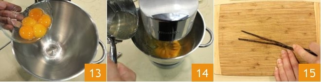 Entre-temps, placez les jaunes d'œufs dans un batteur sur socle 13 et commencez à les travailler à vitesse maximale ; ajoutez le sirop de sucre en filet 14 et fouettez jusqu'à refroidissement complet. Pendant que les jaunes montés refroidissent, fendez une gousse de vanille dans le sens de la longueur et extrayez les graines en les grattant avec un petit couteau 15.