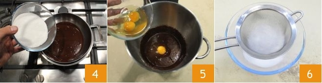 le sucre 4, en remuant pour tout faire fondre. Transférez le mélange dans un batteur sur socle équipé de fouets et laissez tiédir; ajoutez les œufs un à un, en veillant à ce que le précédent soit bien incorporé avant d'ajouter le suivant 5 : actionnez le fouet et mélangez. Tamisez la levure 6,