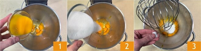 Pour préparer le gâteau fête des pères, commencez par la génoise : versez dans le bol d'un batteur muni de fouets les œufs, les jaunes 1, le sucre 2 et une pincée de sel 3
