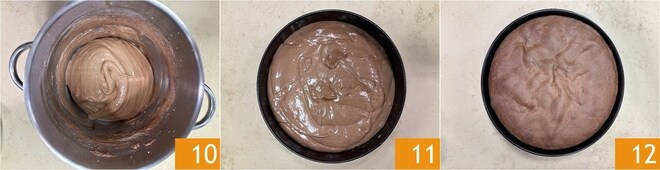 La pâte est prête 10, versez-la dans un moule de 26 cm de diamètre, beurré et fariné 11. Nivelez la surface avec le dos d'une cuillère et faites cuire la génoise dans un four statique préchauffé à 180°C pendant 30-35 minutes. Avant de démouler, vérifiez la cuisson avec un cure-dent. Laissez refroidir complètement dans le moule 12