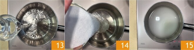 Préparez le sirop : versez dans une casserole l'eau 13 et le sucre 14, puis chauffez à feu moyen 15