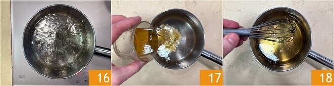Dès que le mélange atteint l'ébullition 16, retirez-le du feu. Laissez refroidir le mélange, puis ajoutez le rhum 17, mélangez avec le fouet et réservez 18