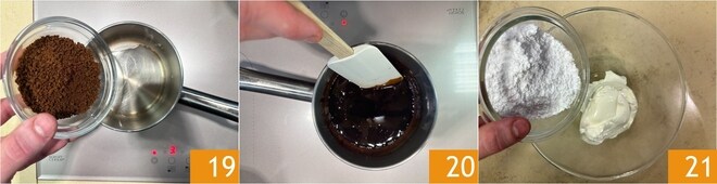 Préparez la crème : dans une casserole, versez l'eau et le café soluble 19, chauffez le mélange sur le feu et mélangez jusqu'à ce que le café soit complètement dissous sans laisser de grumeaux 20. Dans un bol, versez le mascarpone et le sucre glace 21