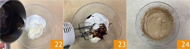 Ajoutez le café 22 et montez la crème avec les fouets électriques 23 pour homogénéiser 24