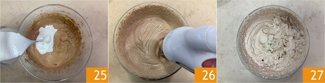 Incorporez enfin la crème liquide 25 et fouettez 26 jusqu'à obtenir une consistance dense et compacte, mais en même temps lisse et crémeuse 27