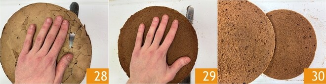 Lorsque la génoise est froide, éliminez la croûte en surface avec un couteau à dents, 28. Pratiquez une coupe horizontale au centre de la génoise 29 de manière à obtenir deux moitiés égales prêtes à être garnies 30.