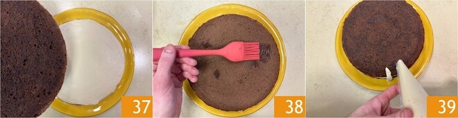 Posez le second disque sur la crème 37 et badigeonnez également avec le sirop l'autre côté 38. Avec l'aide de la poche à douille, formez des petits tas de crème sur le bord 39 40.
