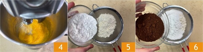 Montez le mélange pendant environ 10 minutes à pleine vitesse 4, jusqu'à obtenir un mélange très mousseux. Pendant ce temps, dans un bol, tamisez la farine, la fécule 5 et le cacao 6