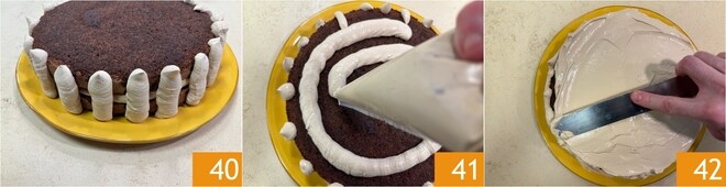 Répartissez également de la crème en surface 41, puis nivelez avec la spatule tout le gâteau 42