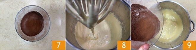 Tamisez les poudres une deuxième fois 7, cela aidera à obtenir une génoise très moelleuse. Une fois que le mélange de sucre et d'œufs est bien monté 8, incorporez les poudres avec la spatule, petit à petit et délicatement 9 en mélangeant de bas en haut.