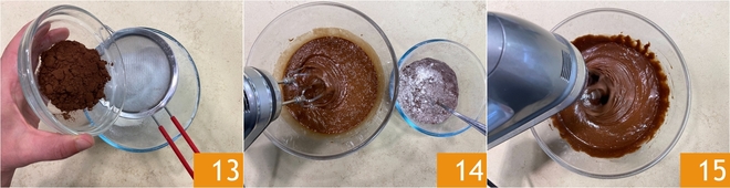 Tamisez également le cacao à l'intérieur 13. Relancez le batteur à vitesse modérée et ajoutez les ingrédients secs petit à petit 14; mélangez jusqu'à obtenir un mélange homogène 15.