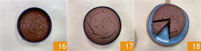 Versez le mélange dans un moule beurré de 22 cm 16. Enfournez dans un four statique préchauffé à 165°C pendant 50 minutes. Faites toujours le test du cure-dent avant de sortir le gâteau du four 17. Laissez-le refroidir et servez-le 18.