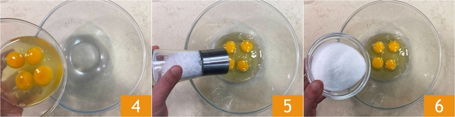 Entre-temps, versez les œufs à température ambiante dans un bol 4; ajoutez une pincée de sel 5 et le sucre 6.