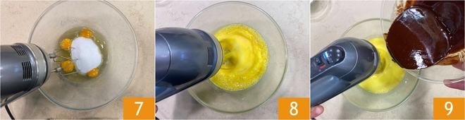 Travaillez avec un batteur électrique 7 jusqu'à obtenir un mélange clair et mousseux 8. Maintenant, toujours avec le batteur en marche, versez en filet le mélange de beurre et chocolat désormais tiède 9.