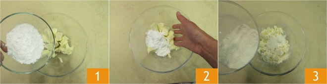 Pour préparer le gâteau gourmand avec mousse au chocolat, commencez par préparer le crumble. Dans un bol, versez le beurre mou, ajoutez le sucre glace 1 et commencez à pétrir avec les mains 2. Ajoutez ensuite la farine 3.
