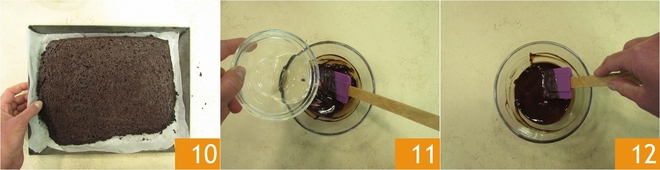Faites cuire dans un four statique préchauffé à 180° pendant 10-15 minutes. Puis sortez du four 10 et laissez refroidir. Quand le crumble est à température ambiante, faites fondre le chocolat noir dans un bol, ajoutez l'huile végétale 11 et mélangez rapidement pour émulsionner 12.