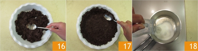 Transférez le mélange dans un moule à bord amovible de 22 cm 16 et, avec le dos d'une cuillère, pressez-le pour recouvrir à la fois la base et les bords 17. Placez au réfrigérateur pour raffermir. Passez maintenant à la pasteurisation des œufs nécessaires à la mousse. Dans une casserole, versez 100 g de sucre et l'eau 18. Allumez le feu et mesurez la température avec un thermomètre, elle doit atteindre 121°.