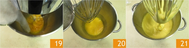 Pendant que le sirop arrive à ébullition, cassez les œufs dans le bol d'un batteur équipé d'un fouet et commencez à les monter. Après environ une minute, ajoutez les 100 g de sucre restants 19 et dès que le sirop atteindra 121°, versez-le en filet, en travaillant à vitesse moyenne-élevée. Laissez-le couler le long des parois du bol 20. Continuez à fouetter jusqu'à ce que le mélange soit à température ambiante 21. Cela prendra environ 5 minutes.