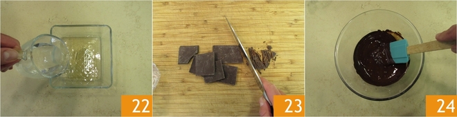 Entre-temps, faites tremper la gélatine dans de l'eau froide 22. Hachez grossièrement le chocolat 23 et faites-le fondre au micro-ondes ou au bain-marie 24.
