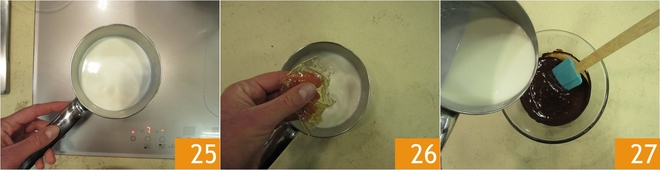 Chauffez la crème dans une casserole 25 et dès qu'elle atteint l'ébullition, ajoutez la gélatine égouttée 26. Mélangez bien pour la dissoudre 26, puis incorporez-la au mélange en 3 fois 27.